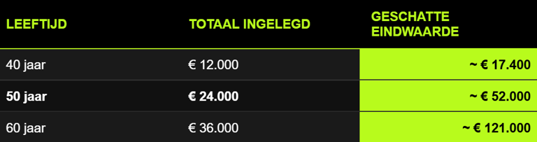 Dit zijn schattingen op basis van historisch gemiddeld rendement. In de praktijk zal het rendement per jaar variëren — soms hoger, soms lager, soms negatief. Maar de richting op de lange termijn is historisch gezien consistent omhoog geweest.